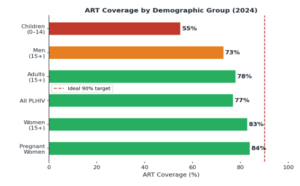 • Children (0–14) face the widest treatment gap: only 55% of HIV-positive children access ART, vs. 83% of adult women.