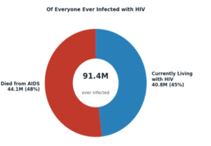 • 48% of all people ever infected with HIV (44.1M out of 91.4M) have died from AIDS-related illnesses since the epidemic began.